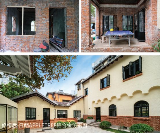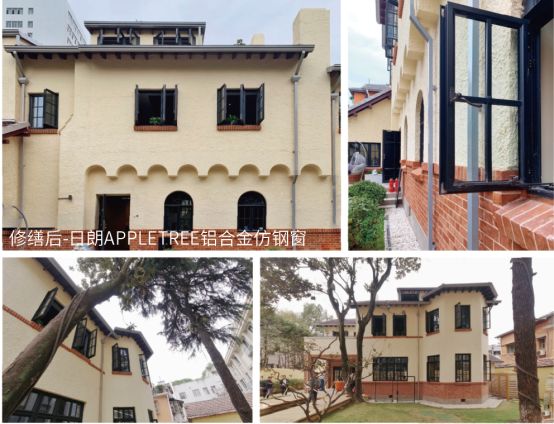 近现代砖木建筑多使用木门窗,常见为平开式、带亮子的的实木门窗。本案中原有门窗已被替换成现代的塑钢推拉窗,但是考虑到门窗对外立面形象的重要影响,设计师考察了颐和路历史文化街区的民国实木门窗后遵守“原状修复”的原则进行了复原工作,选用了日朗仿钢制铝合金门窗。